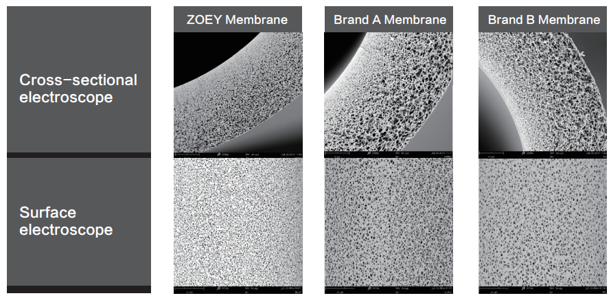 The section microstructure shows that ZOEY’s hollow fiber membrane has the tightest dense layer, the smallest aperture change, and more uniform surface distribution compared with other 2 types membranes.